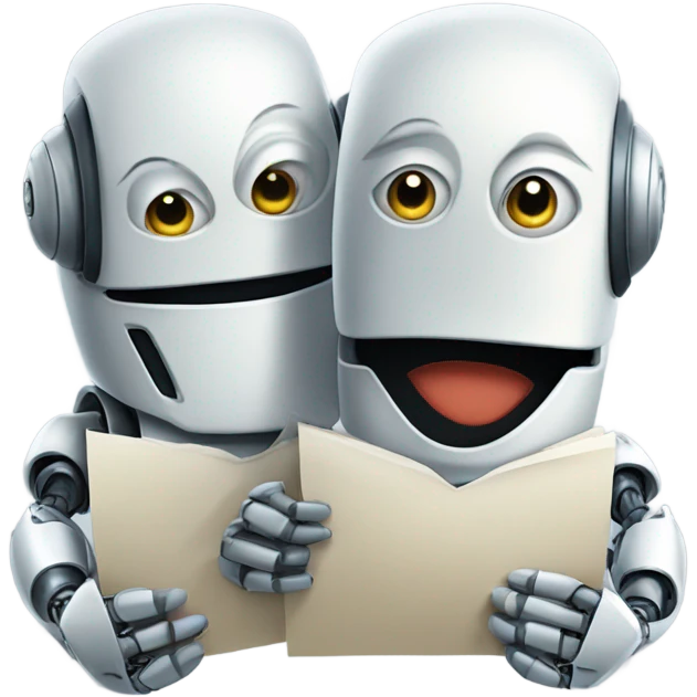 A robot with a mischievous smirk holding a secretive document, another robot with a neutral expression. emoji | AI Emoji Generator
