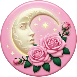 A round pink button with a light cream full damask style moon and pink roses in the center emoji