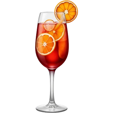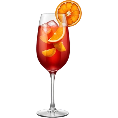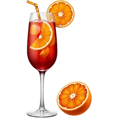 A tall elegant wine glass filled with bright red Campari spritz, with bubbles, an orange slice, and a curled orange peel garnish. emoji