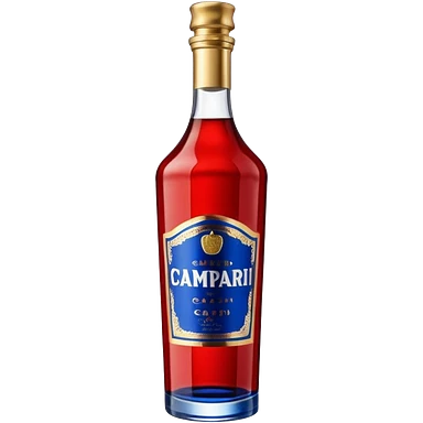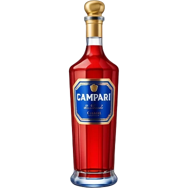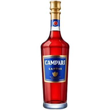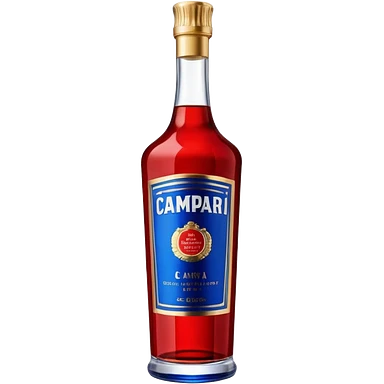 A tall red Campari bottle with a gold cap, bold blue-and-white label, and textured ridged glass at the bottom. Glossy, elegant, iconic look. emoji