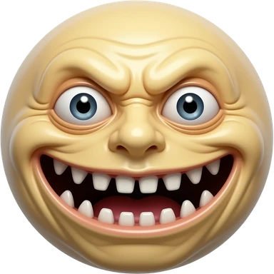 A grotesquely realistic, distorted smiley-face orb with deeply furrowed skin and a wide, agape mouth full of irregular, crooked teeth. Its sunken, human-like eyes stare outward with a haunting, frenzied intensity. emoji