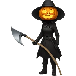 Human pumpkin hunter with a scythe, glowing pumpkin eyes inside a black helmet, Halloween theme, emoji" emoji
