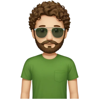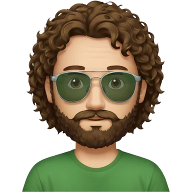 a self asured white male. brown hair. green t-shirt. blue background 5 days beard. sunglasses. longer curly hair emoji
