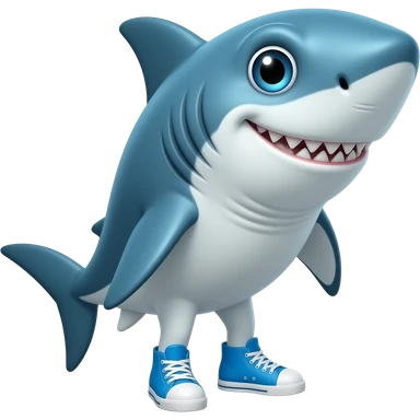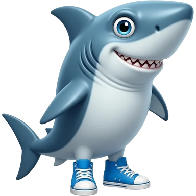 a shark with a sleek blue body, big expressive eyes, and a slightly goofy grin. wears bright blue sneakers, giving him a funny, cartoonish vibe with a mix of cool and absurd energy he dose not stand like a human but like a dog he has four blue sneakers om each fin emoji | AI Emoji Generator