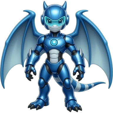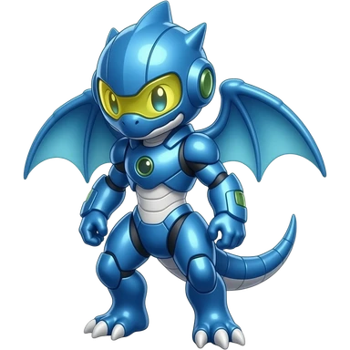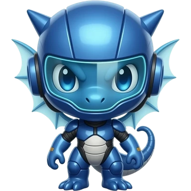 a shiny blue Genesect-Flygon-Raptor-Fakémon—hybrid with a futuristic visor-helmet full body emoji