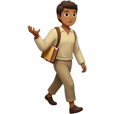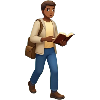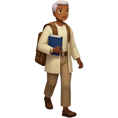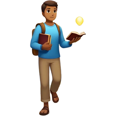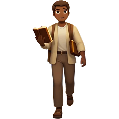 A man walks from darkness and inner conflict toward a glowing light in his chest, guided by intuition. Along the path, he passes through ambition and emptiness, then reaches a radiant mountaintop where healing transforms him into a fulfilled guide, holding a book and offering his hand to others. emoji