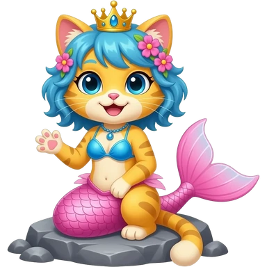 femboy yellow cat furry happy blue eyes with blue with pink flowers and crown hair blue bikini top light yellow mermaid tail with pink fins sitting on a rock emoji