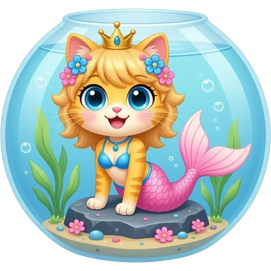 femboy yellow cat furry happy blue eyes with blue with pink flowers and crown hair blue bikini top pink mermaid tail with light pink fins sitting on a rock in a fish tank emoji