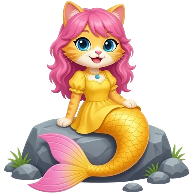 femboy yellow cat furry happy blue eyes with pink hair yellow dress attached to long light yellow mermaid tail with pink fins sitting on a rock emoji