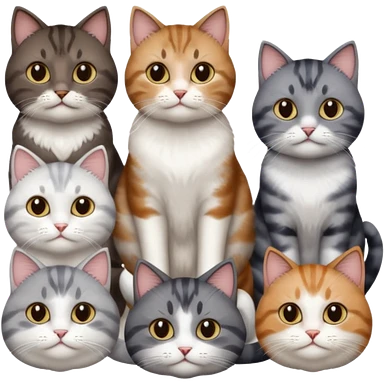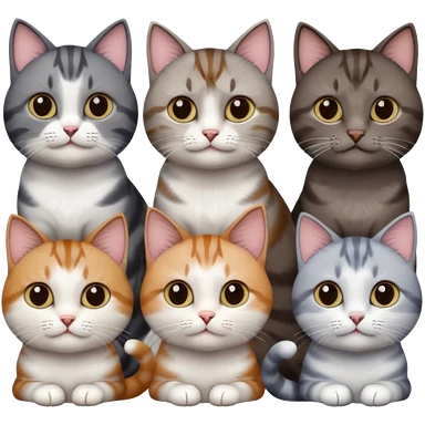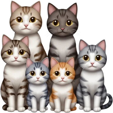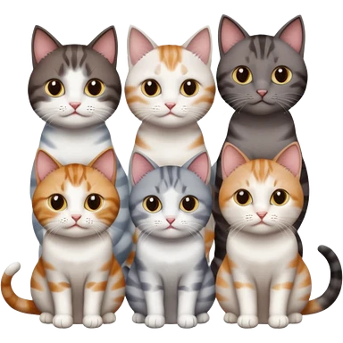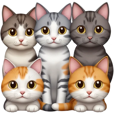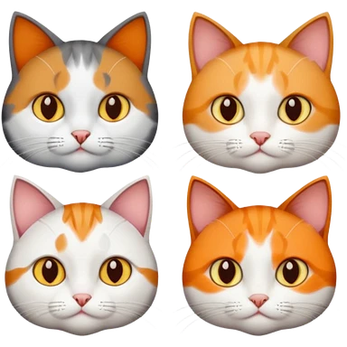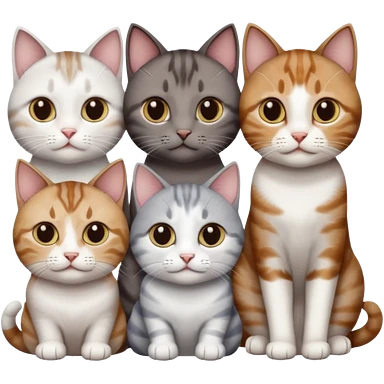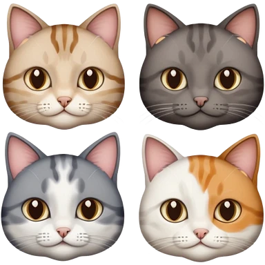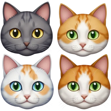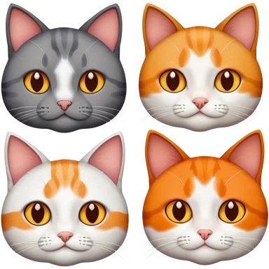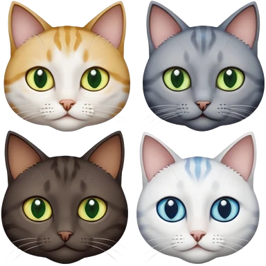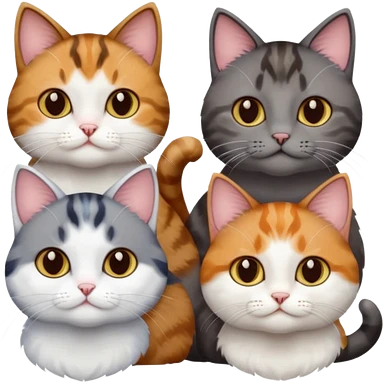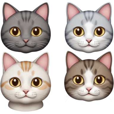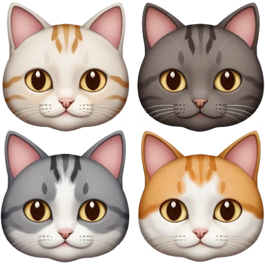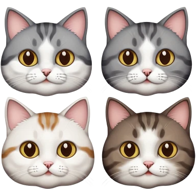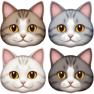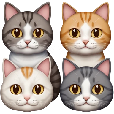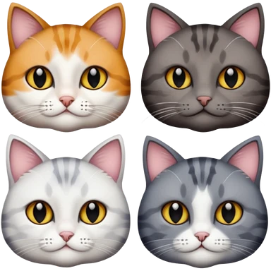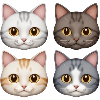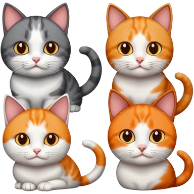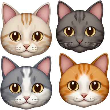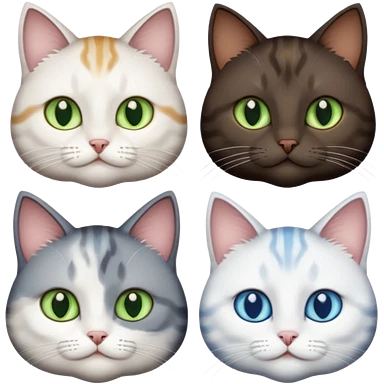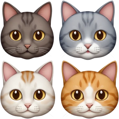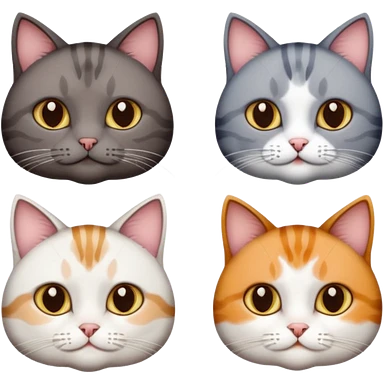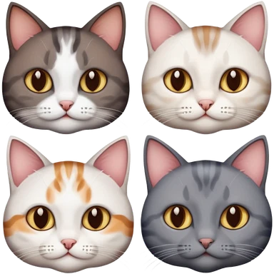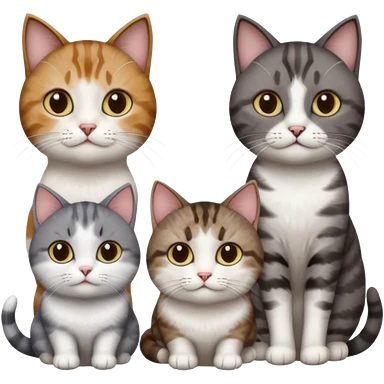 4 different coloured short haired cats including; a dark brown tabby and white cat, and a dark grey and white emoji