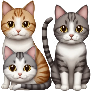3 different coloured short haired cats including; a dark brown tabby and white cat, and a dark grey and white emoji