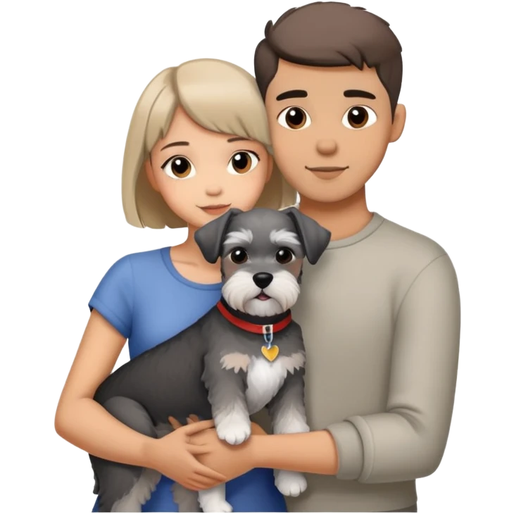 a shorthair girl with boyfriend hugging a Schnauzer dog emoji | AI Emoji Generator