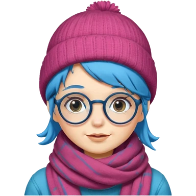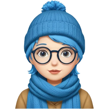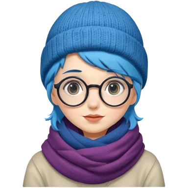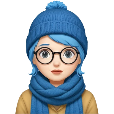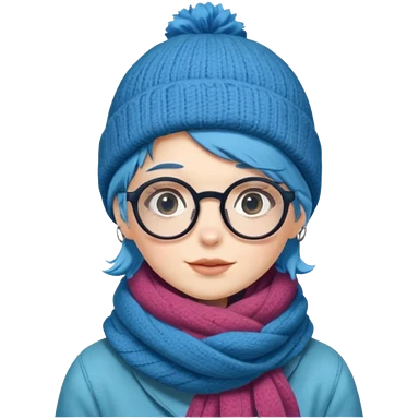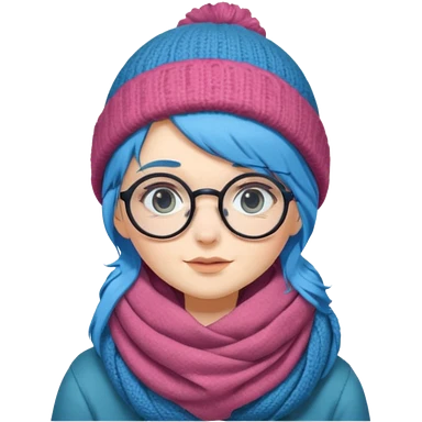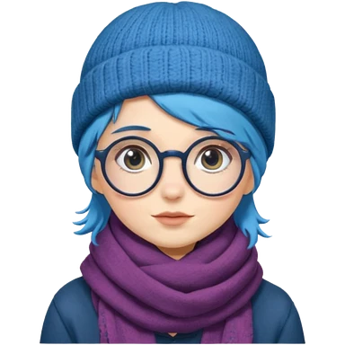 A shy blue straight hair woman with big round glasses and thick scarf and a beanie, blushing from the cold. emoji