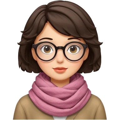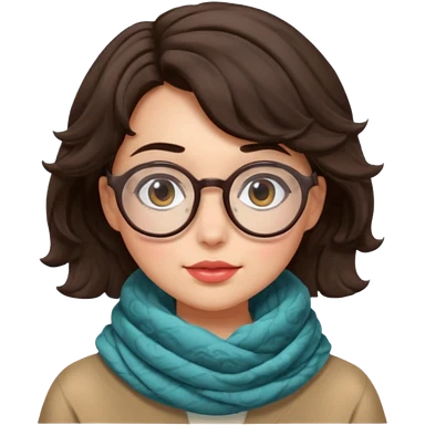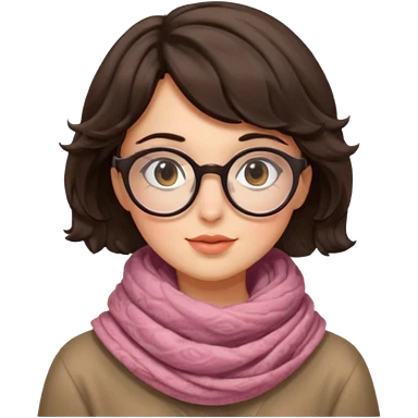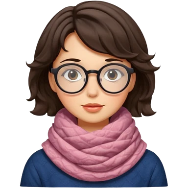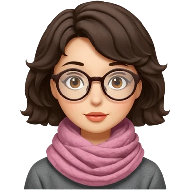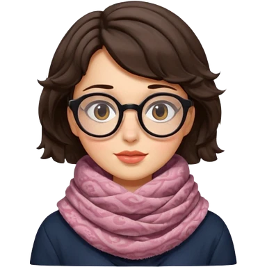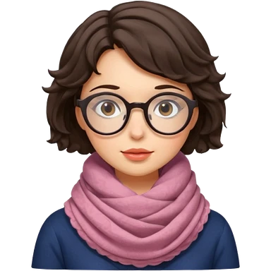 A shy brunette hair wavy short hair woman with big round glasses and thick scarf, blushing from the cold. emoji