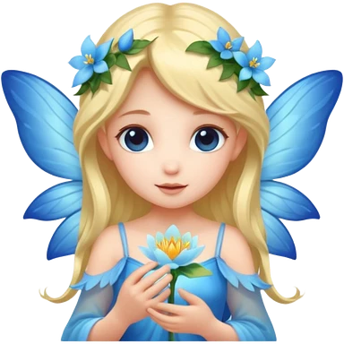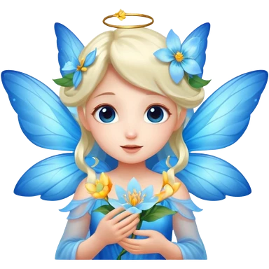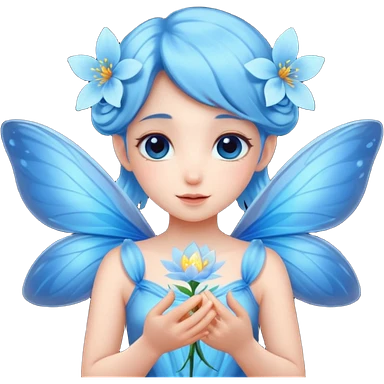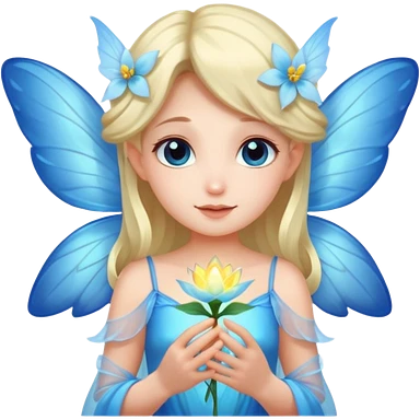 A shy fairy with soft blue wings, gently holding a glowing blossom. emoji