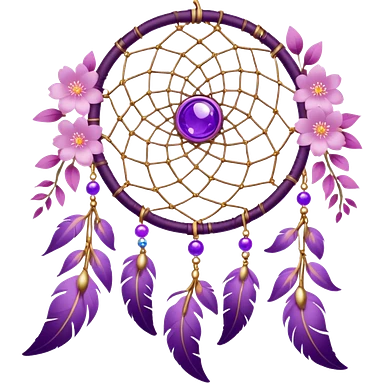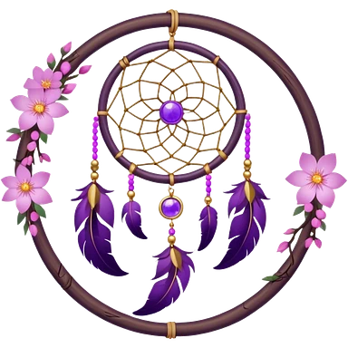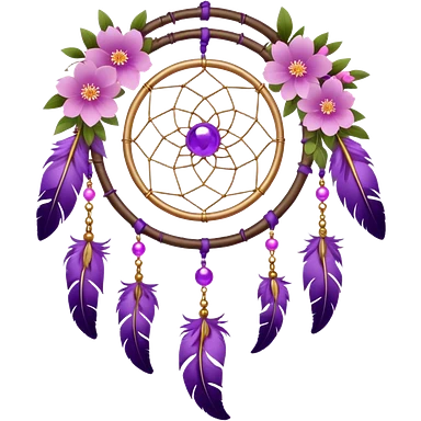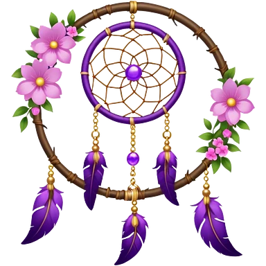 A silver-framed Dreamcatcher. with purple-round-orbs, gold-rings hanging down. purple flowers, pink sakura flowers, emoji | AI Emoji Generator