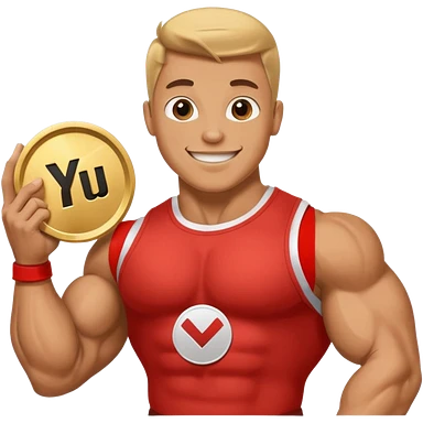 A bold, expressive emoji-style character flexing his bicep while holding a dumbbell in one hand. Bright colors, simple features, rounded edges, and a friendly, energetic look. emoji