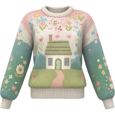 Still life, render, isolated, whimsical cottagecore pattern print and color scheme, womens sweater, highly detailed, 8k. No emoji icons, no emoji faces, no human figures emoji