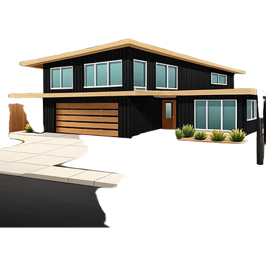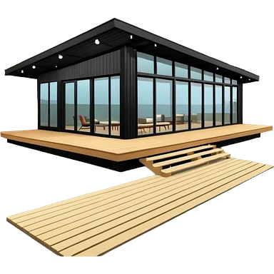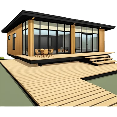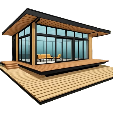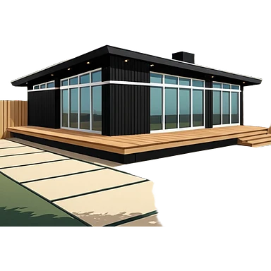 midcentury modern house with 1000 sqft and all windows and a sliding windows on corner. Single story. High ceilings, black and vertical wood slats for outside walls of home. Wood deck with complementary but different wood and shade from larger wood slats. With overhanging shade and slats. emoji