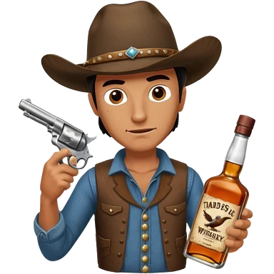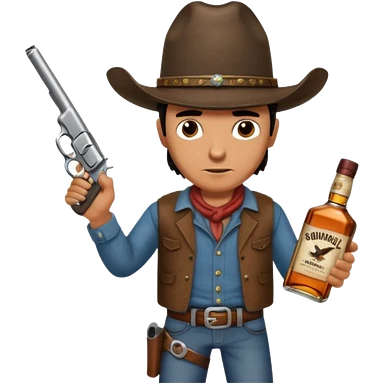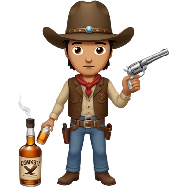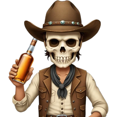 A rough and tumble cowboy with a 6 shooter and a bottle of whiskey. From the view of a bird looking down on the cowboy. Make the graphics dark and gritty in the style of your beeding skull art. Just a skull with a cowboy hat this rime emoji