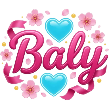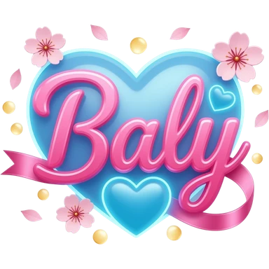 A sleek, sky blue text 'Baly' decorative symbols, adorned with satin ribbons and glowing neon-colorful hearts. Surrounded by floating cherry blossom petals and golden bokeh. Vibrant, modern, and feminine with a cinematic glow emoji