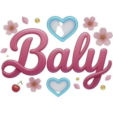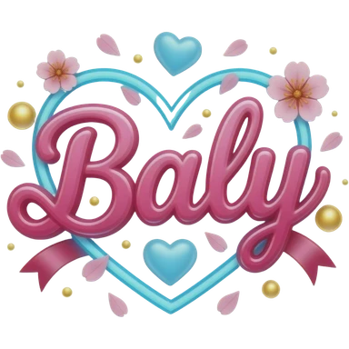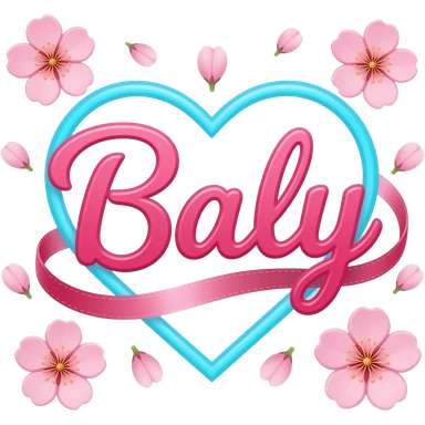A sleek, sky blue text 'Baly' decorative mail, adorned with satin ribbons and glowing neon-pink hearts. Surrounded by floating red blossom petals and golden bokeh. Vibrant, modern, and feminine with a cinematic glow emoji | AI Emoji Generator