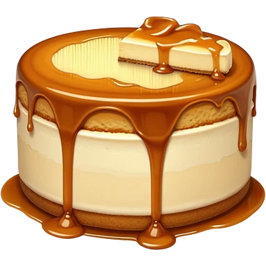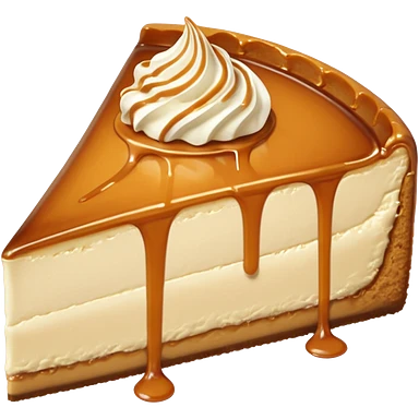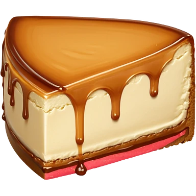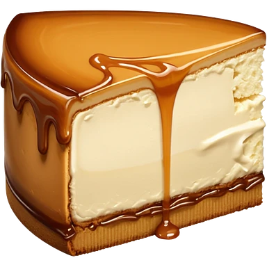 a slice of cheesecake. The base is made of light brown biscuit; the first layer of filling is caramelized dulce de leche, and the upper layer is creamy, light beige, and has a smooth texture. On top, there is a caramelized dulce de leche topping dripping down the center of the slice emoji | AI Emoji Generator