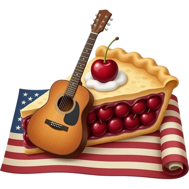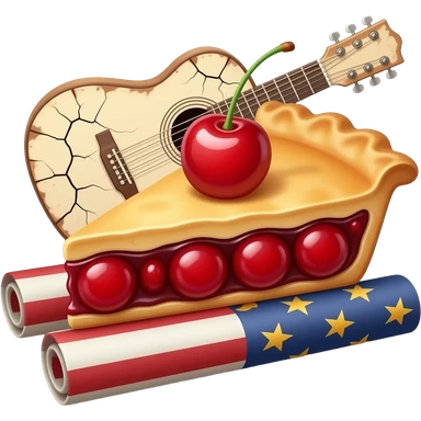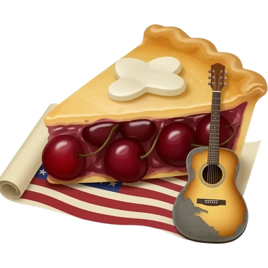 An old guitar peeks out from a piece of cherry pie that is placed on a rolled-up old American flag. emoji