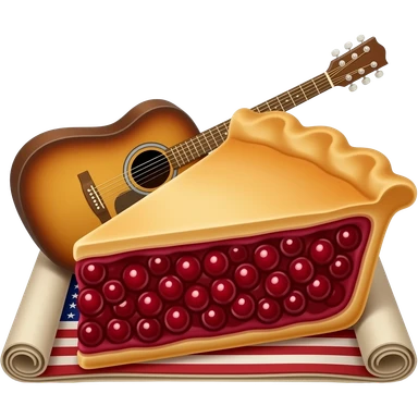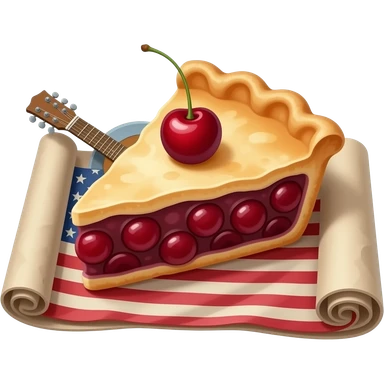 A guitar peeks out from a piece of cherry pie that is placed on a rolled-up old American flag. emoji