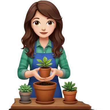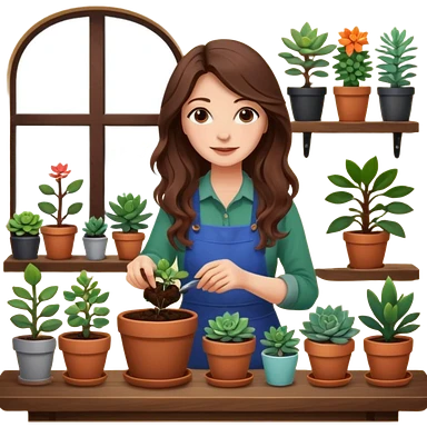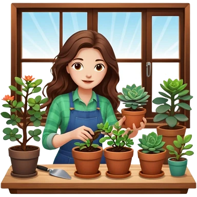 Close-up of a woman with long, wavy brown hair planting a seedling in a pot. Surrounding her are plants and succulents with vibrant leaves and flowers. Sunlight filters through the window, casting soft shadows. A cozy interior space with gardening tools on a wooden table. emoji