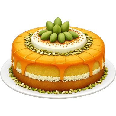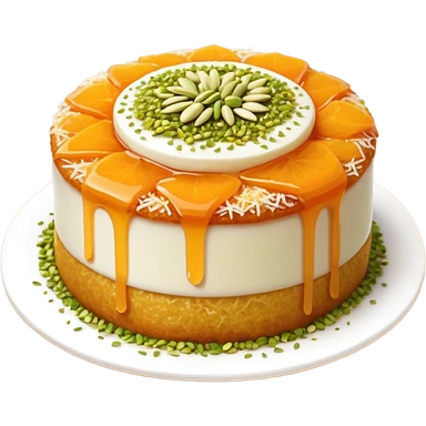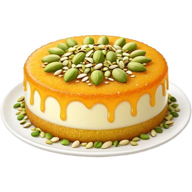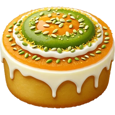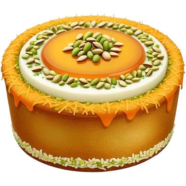 A small round emoji of traditional kanafeh with golden-orange crispy threads, a gooey white cheese center, and a light sprinkle of green pistachios. Warm and delicious-looking.emoji