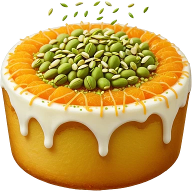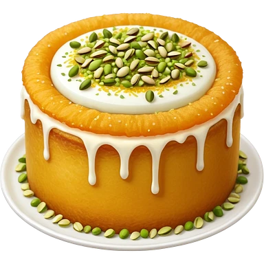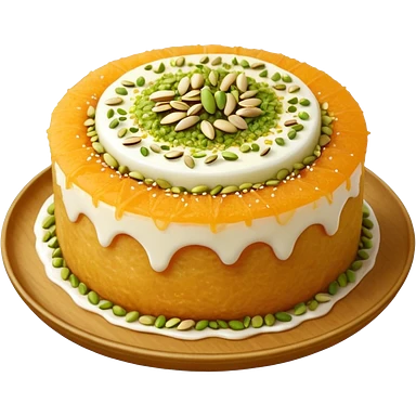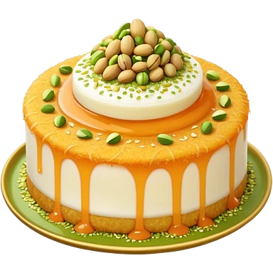 A small round emoji of traditional kanafeh with golden-orange crispy threads, a gooey white cheese center, and a light sprinkle of green pistachios. Warm and delicious-looking. emoji | AI Emoji Generator