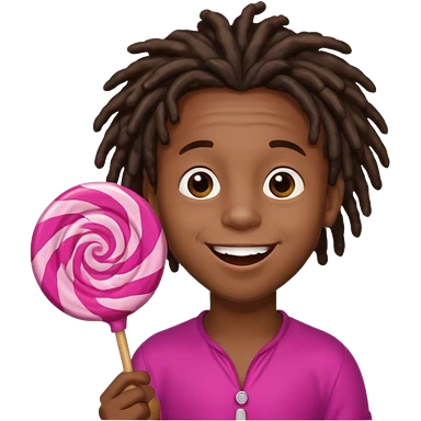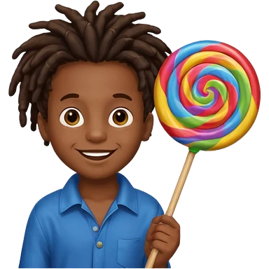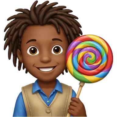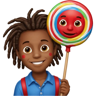 A small black dread lock hair boy holding a giant lollipop, smiling with sticky cheeks. emoji