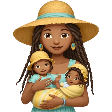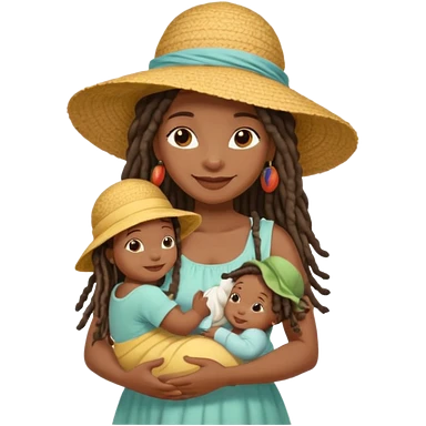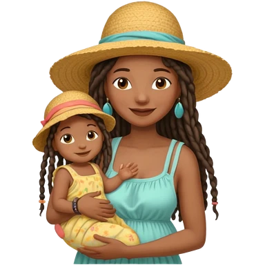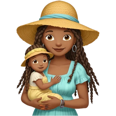 A black mom with long dread lock hair in a sunhat holding her baby gently, wearing a sun-dress while smiling softly. emoji