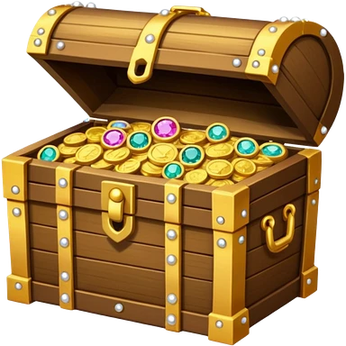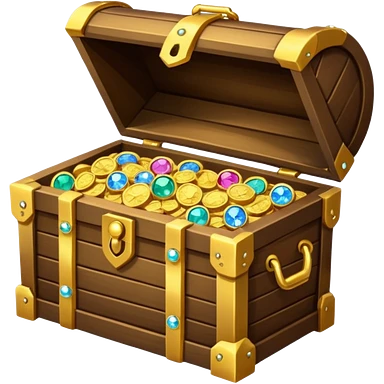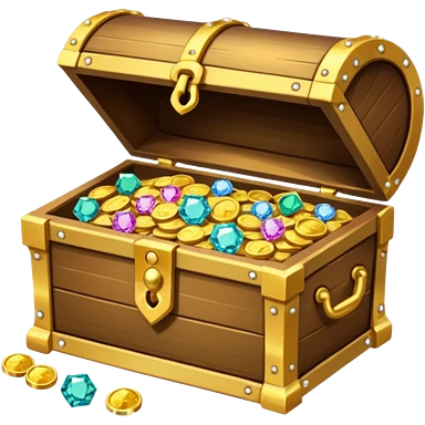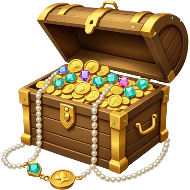 A treasure chest is slightly open and peeking out from inside are treasures: colored diamonds, gold necklaces, pearls, and gold coins. emoji