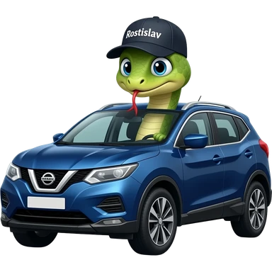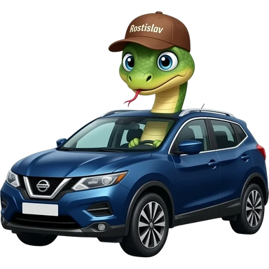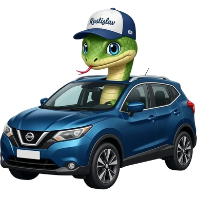 A snake in a cap with the inscription "Rostislav" is driving a dark blue Nissan Qashqai. emoji