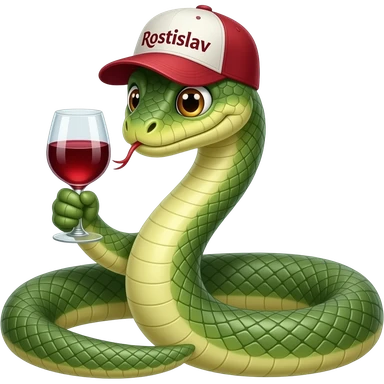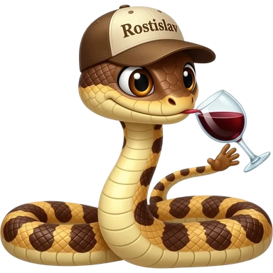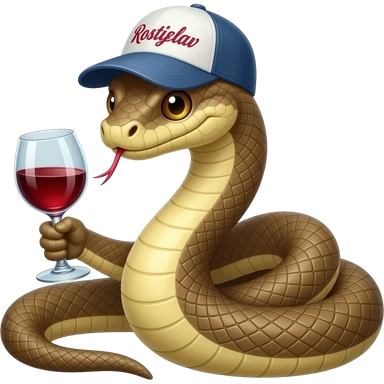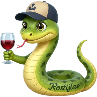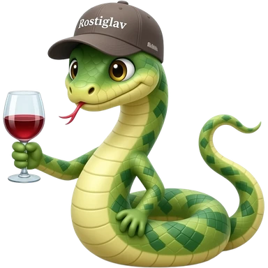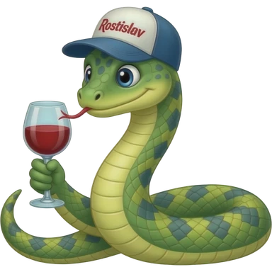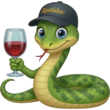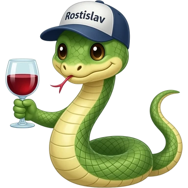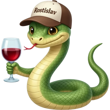 A snake in a cap with the inscription "Rostislav" holding a glass of wine with its tail emoji