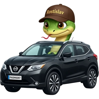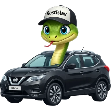 A snake in a cap with the inscription "Rostislav" is driving a black Nissan Qashqai. emoji