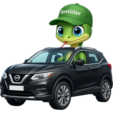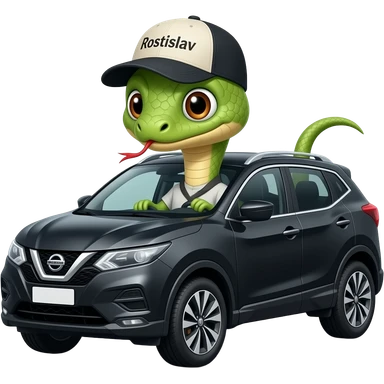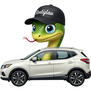 A snake in a cap with the inscription "Rostislav" is driving a Nissan Qashqai. emoji