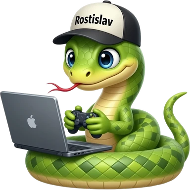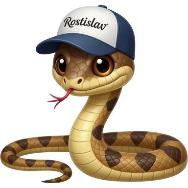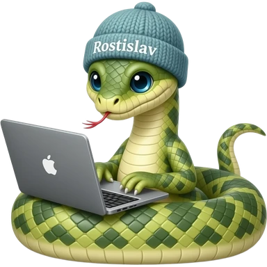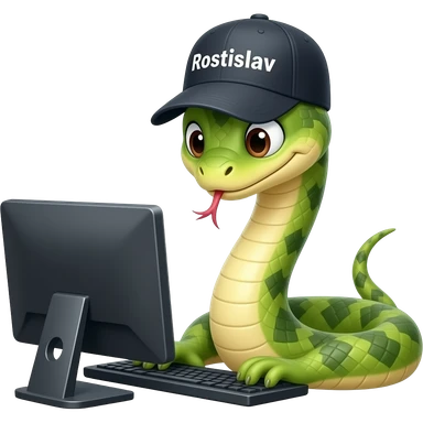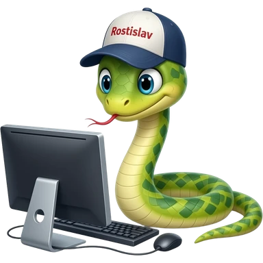 A snake in a cap with the inscription "Rostislav" plays on the computer. emoji