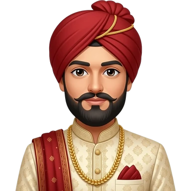 A south Asian Pakistani groom with a longer beard and shorter not curly moustache and cream sherwani. The headwear and shawl should be red emoji | AI Emoji Generator