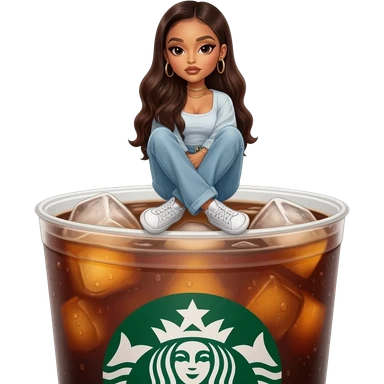 a Starbucks Americano with ice, an Asian girl with messy wavy hair in Ravenclaw robe is sitting on the cup emoji | AI Emoji Generator