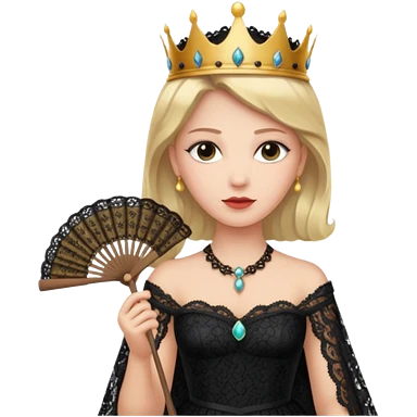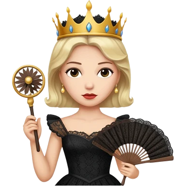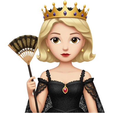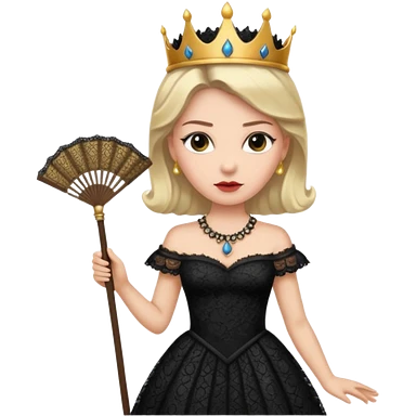 A stern queen with dark lace dress, holding a fan and observing with authority. emoji