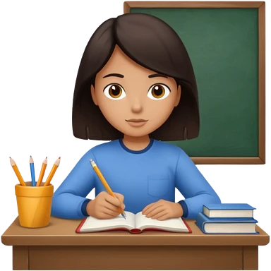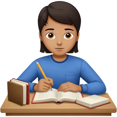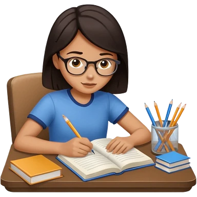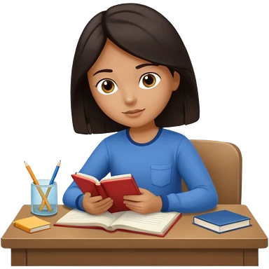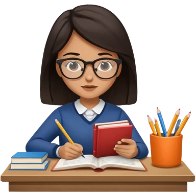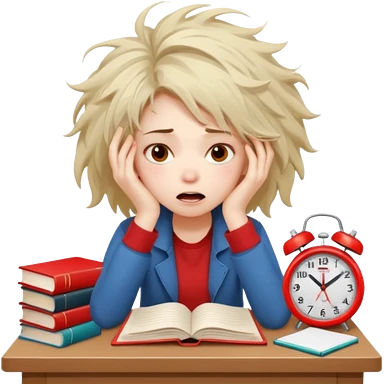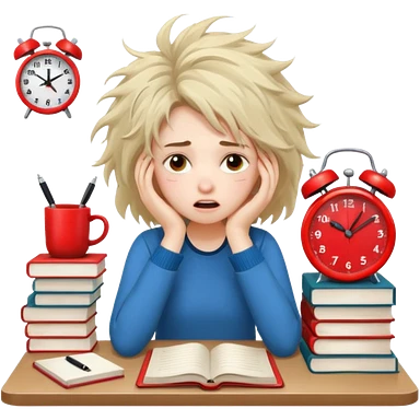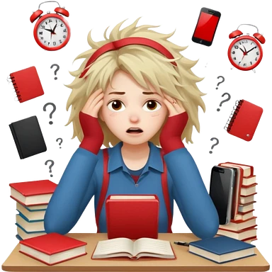 A student girl is sitting in a panic and chaos. On the table, there are a bunch of books, notebooks, and a phone with a red alarm clock on the screen. emoji | AI Emoji Generator