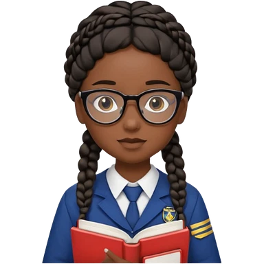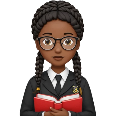 Girl student wearing uniform, glasses, hold book in front of their chest, black braided hair, dark skin emoji