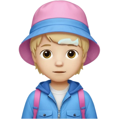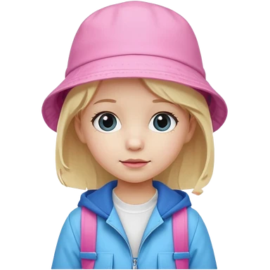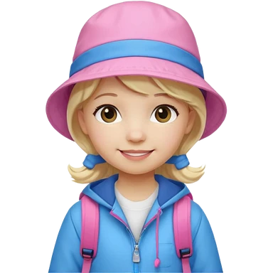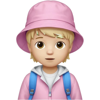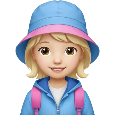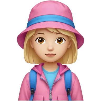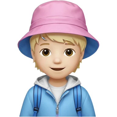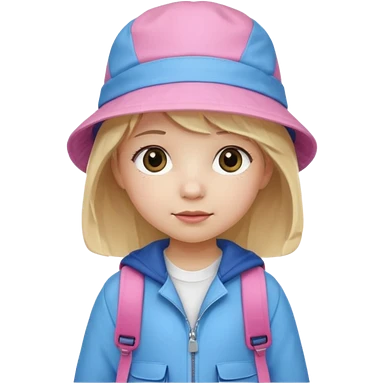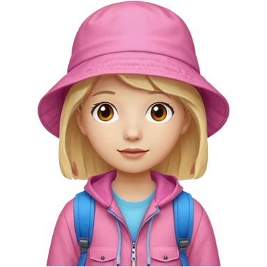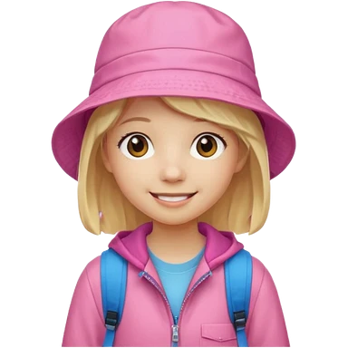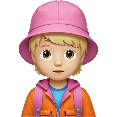 A student white skin, blonde hair, with pink bucket hat, orange jacket, blue backpack emoji | AI Emoji Generator