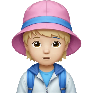 A little boy student white skin, blonde hair, with pink bucket hat, white jacket, blue backpack emoji