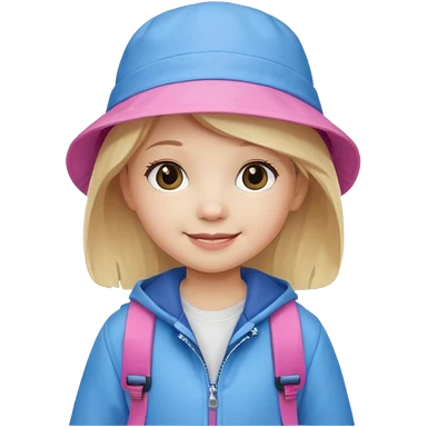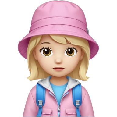 A little girl student white skin, blonde hair, with pink bucket hat, white jacket, blue backpack emoji