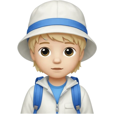 A little boy student white skin, blonde hair, with white bucket hat, white jacket, blue backpack emoji