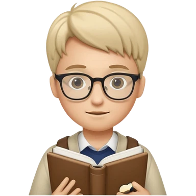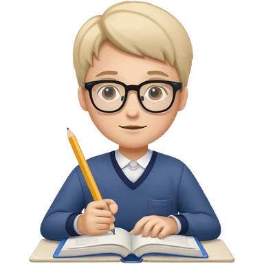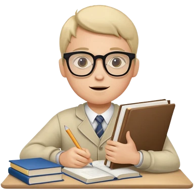 A student with dark hair is reading a book and taking notes in a notebook. There are also papers and textbooks on the table. emoji | AI Emoji Generator